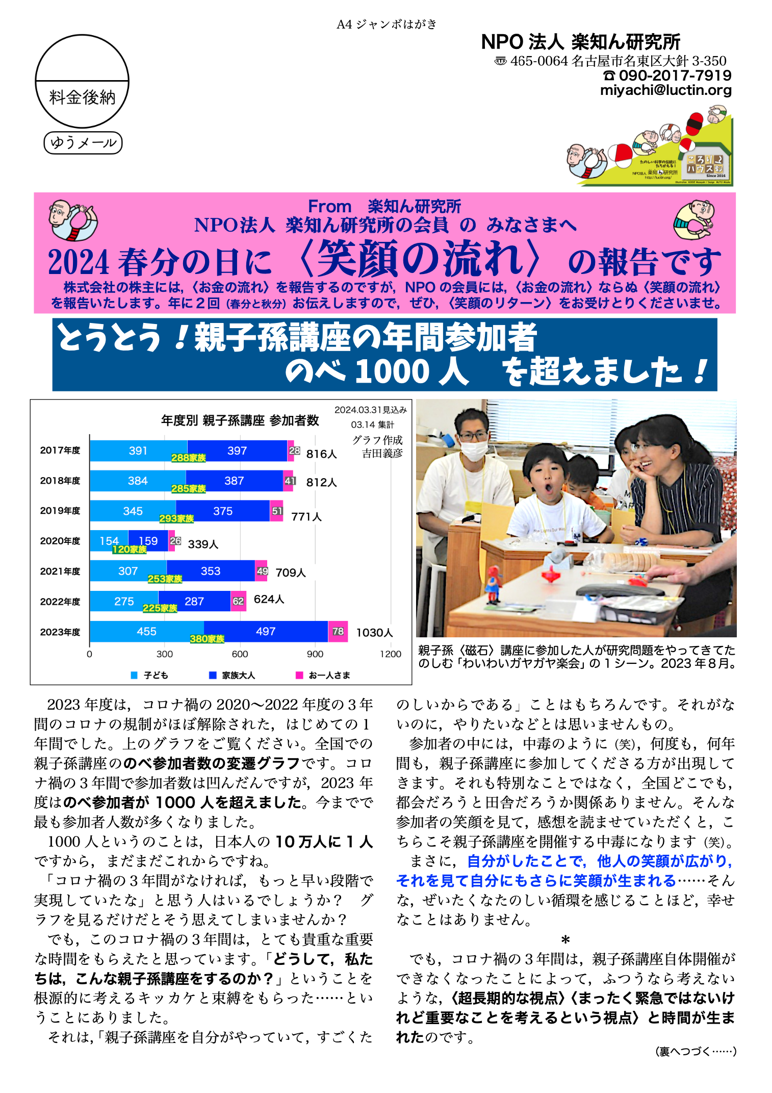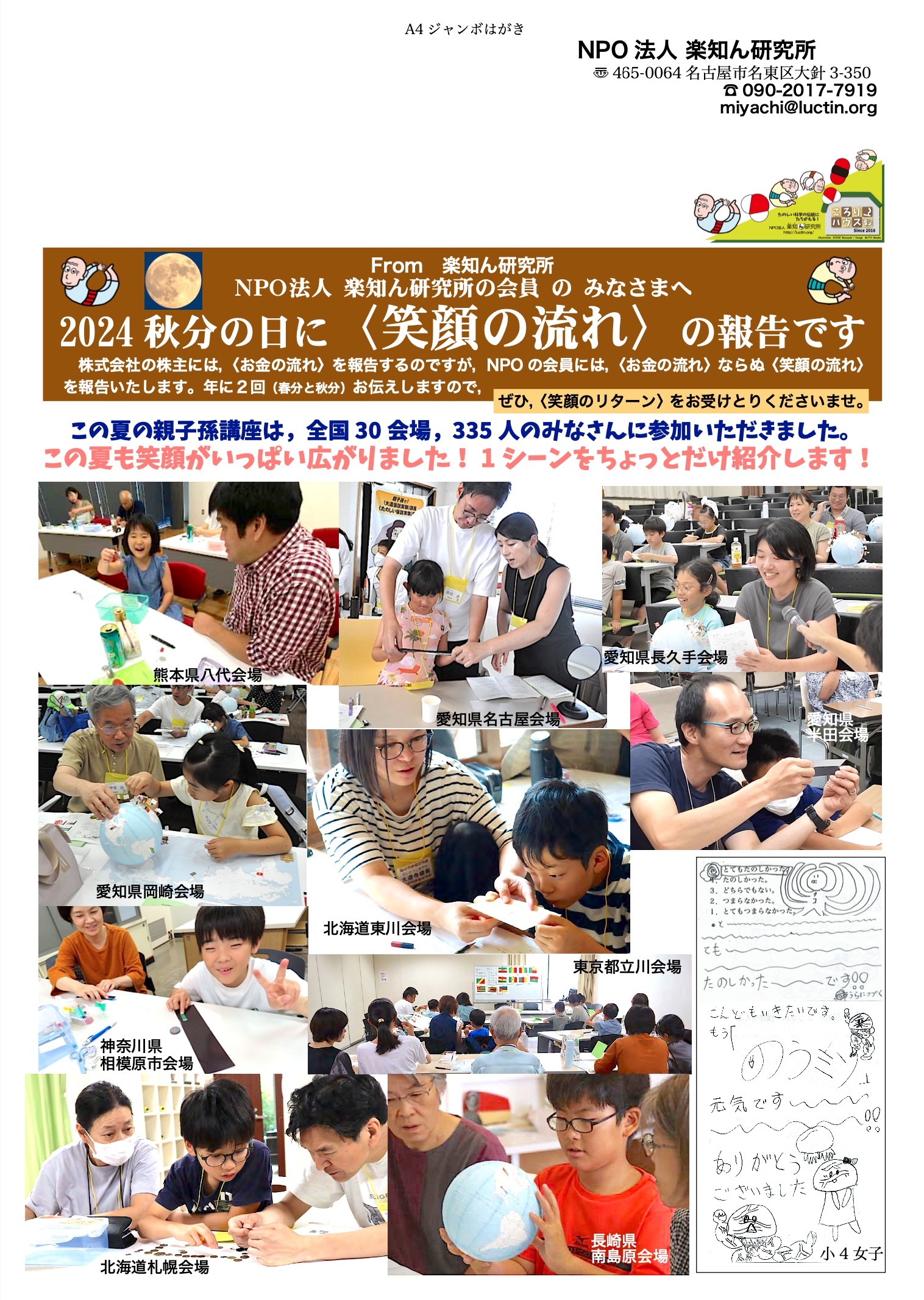 「継続は○○なり」,楽知ん研究所に長~く通い続けて,いろんなことに気づけるようになりました。たのしいからこそ続けられる。毎年,たのしい講座をありがとうございます。