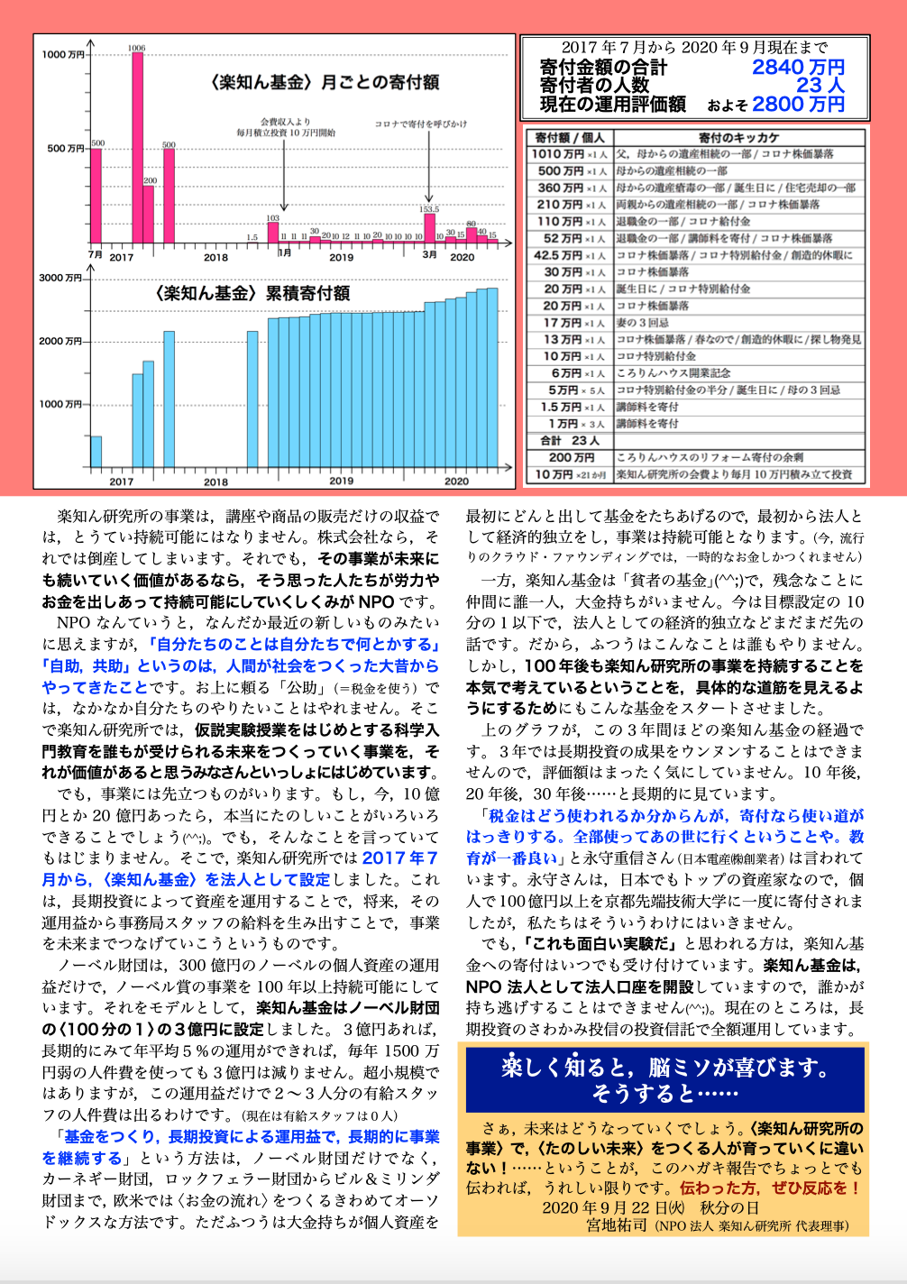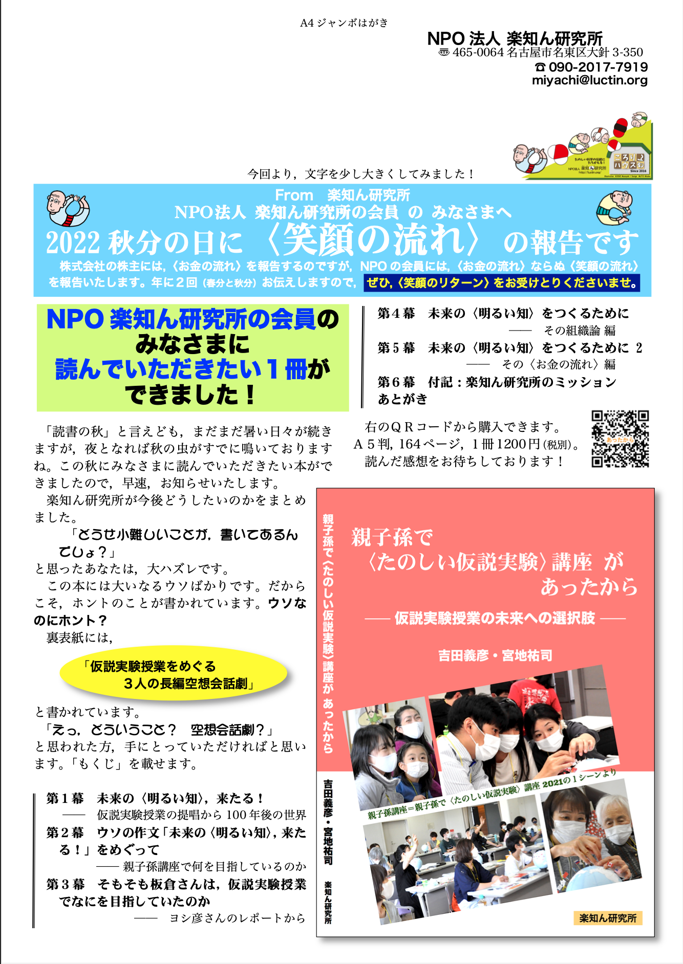 NPO法人楽知ん研究所では,年に2回に,NPO 法人楽知ん研究所の会員のみなさまに,会費を「出資」していた だいているので,その金銭リターンならぬ「笑顔のリターン」をしています。
