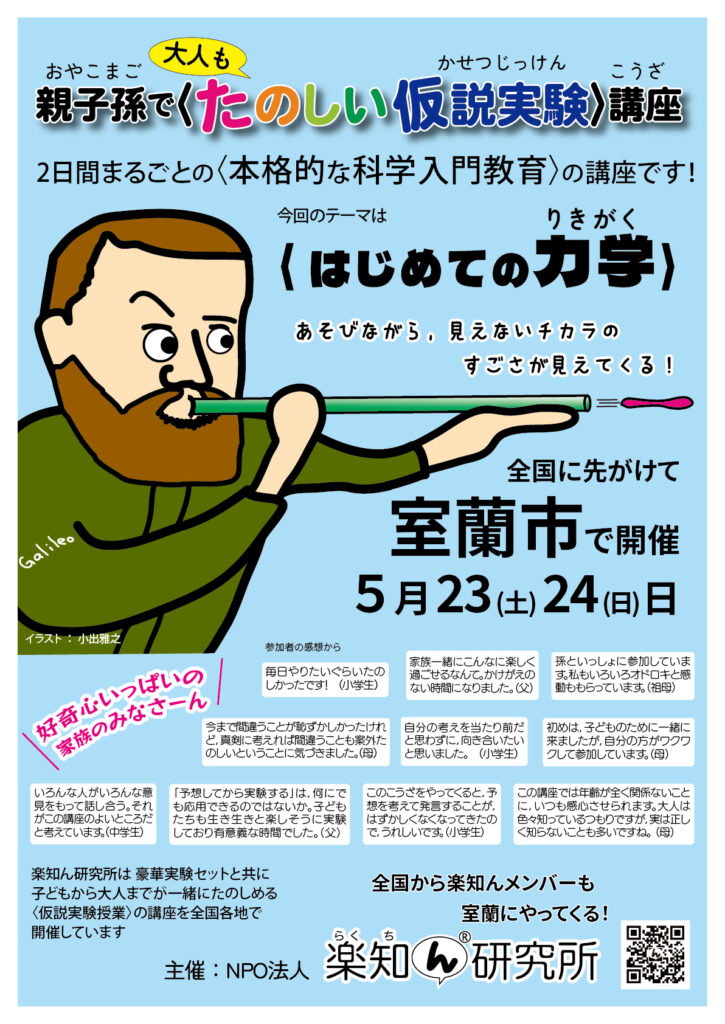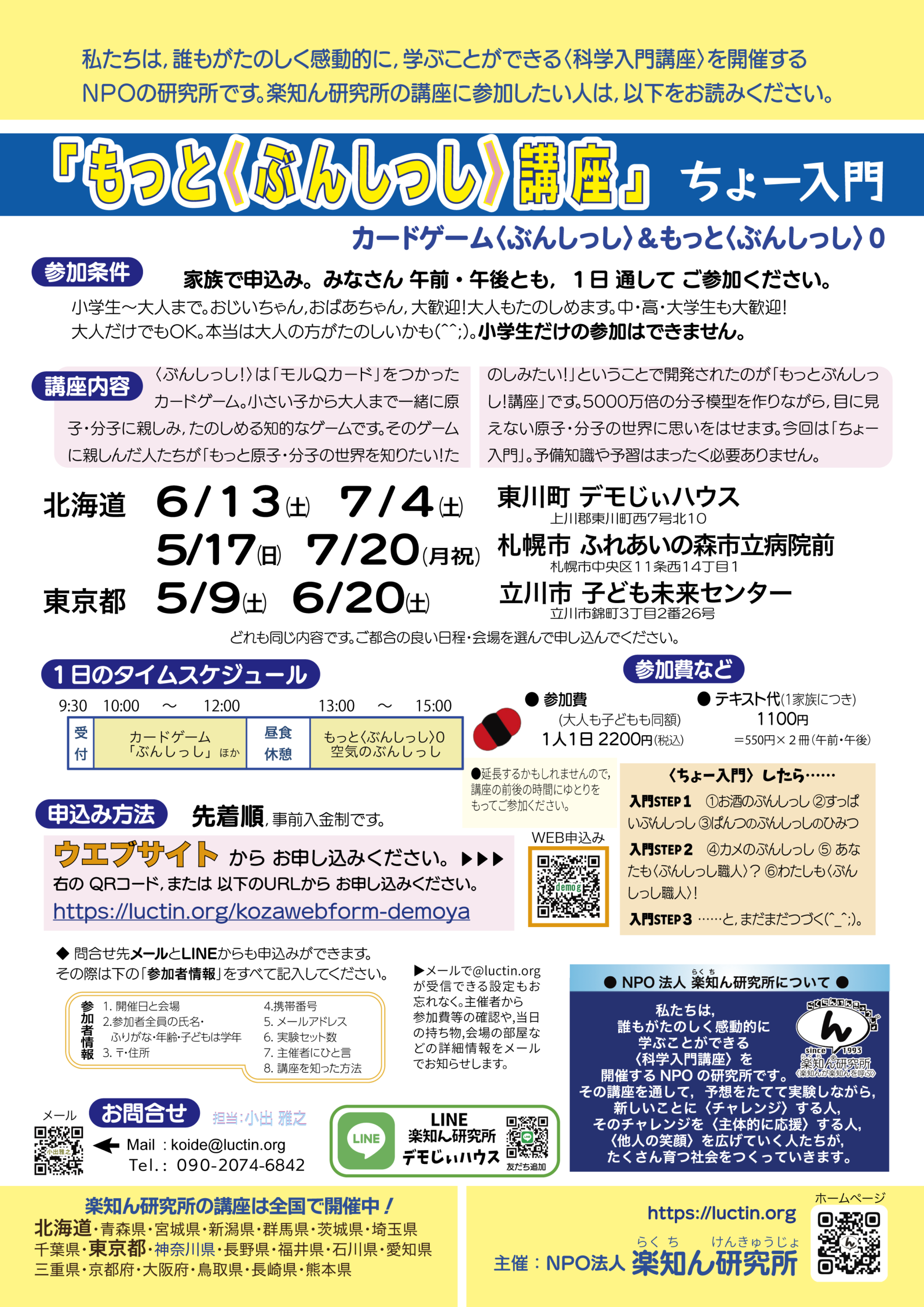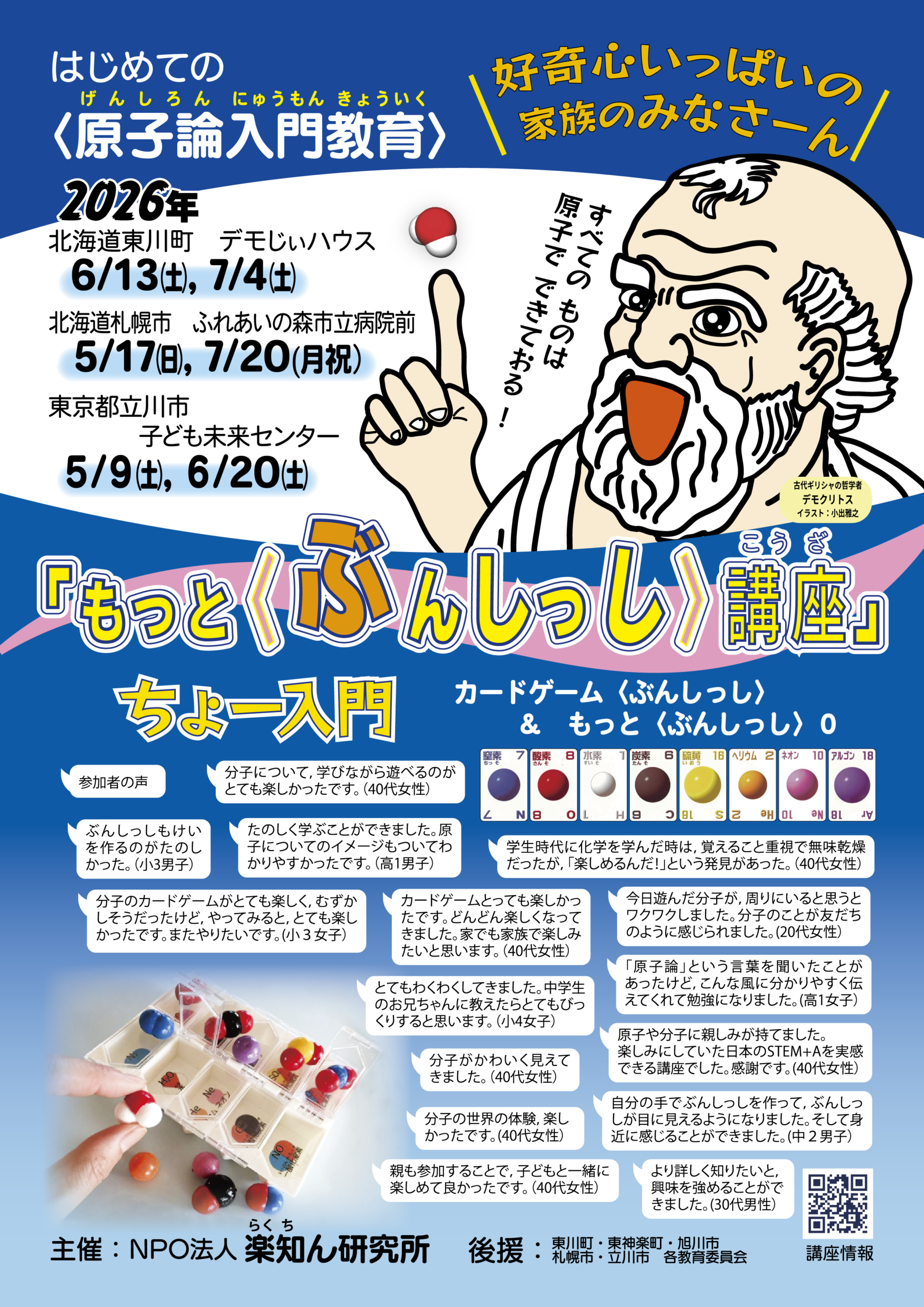 デモじぃハウス講座 ウエブ申し込みフォーム デモじぃハウス主催の講座のウエブ申し込みができます。 ご家族皆さんでどうぞ! お友だちもお誘いくださいね~。 本格的な2日間の科学入門講座 気軽な科学入門講座 気軽な原子論への入門講座 〈親子孫講座〉のファンになっちゃった方限定の講座。参加資格はお問い合わせください。 日付講座/テーマ会場/地域講師募集状況 2026/05/06(水祝)〈しゅぽしゅぽ〉&〈ぶんしっし〉講座デモじぃハウス /北海道東川町小出 雅之募集中 2026/06/13(土) ちょ〜入門 カードゲーム& もっと〈ぶんしっし〉0デモじぃハウス /北海道東川町小出 雅之募集中 2026/07/04(土) ちょ〜入門 カードゲーム& もっと〈ぶんしっし〉0デモじぃハウス /北海道東川町小出 雅之募集中 2026/05/17(日) ちょ〜入門 カードゲーム& もっと〈ぶんしっし〉0ふれあいの森 市立病院前 /北海道札幌市小出 雅之募集中 2026/07/20(月祝) ちょ〜入門 カードゲーム& もっと〈ぶんしっし〉0ふれあいの森 市立病院前 /北海道札幌市小出 雅之募集中 2026/05/09(土) ちょ〜入門 カードゲーム& もっと〈ぶんしっし〉0子ども未来センター /東京立川市小出 雅之募集中 2026/05/10(日)〈しゅぽしゅぽ〉&〈ぶんしっし〉講座子ども未来センター /東京立川市小出 雅之募集中 2026/06/20(土) ちょ〜入門 カードゲーム& もっと〈ぶんしっし〉0子ども未来センター /東京立川市小出 雅之募集中 2026/07/25 ・07/26(2日間) はじめての力学 子ども総合相談センター /北海道旭川市小出 雅之募集中 2026/08/15 ・08/16(2日間) はじめての力学 子ども総合相談センター /北海道旭川市小出 雅之募集中 2026/08/01 ・08/02(2日間) はじめての力学 ふれあいの森 市立病院前 /北海道札幌市小出 雅之募集中 2026/08/22 ・08/23(2日間) はじめての力学 ふれあいの森 市立病院前 /北海道札幌市小出 雅之募集中 2026/07/11 ・07/12(2日間) はじめての力学 子ども未来センター /東京立川市小出 雅之募集中 2026/08/29 ・08/30(2日間) はじめての力学 子ども未来センター /東京立川市小出 雅之募集中 2026/08/08 ・08/00(2日間) はじめての力学 ウリマックホール /北海道鹿追町小出 雅之募集中 以下のすべての項目にご記入ください。 参加講座 : 東川(2026/05/06)〈しゅぽしゅぽ〉+〈ぶんしっし〉また立川(2026/05/09)ちょ〜入門 カード+もっと〈ぶんしっし〉立川(2026/05/10)〈しゅぽしゅぽ〉+〈ぶんしっし〉また札幌(2026/05/17)ちょ〜入門 カード+もっと〈ぶんしっし〉東川(2026/06/13)ちょ〜入門 カード+もっと〈ぶんしっし〉立川(2026/06/20)ちょ〜入門 カード+もっと〈ぶんしっし〉東川(2026/07/04)ちょ〜入門 カード+もっと〈ぶんしっし〉札幌(2026/07/20)ちょ〜入門 カード+もっと〈ぶんしっし〉立川7月〈はじめての力学〉(2026/07/11-12)旭川7月〈はじめての力学〉(2026/07/25-26)札幌8月上旬〈はじめての力学〉(2026/08/01-02)鹿追8月〈はじめての力学〉(2026/08/08-09)旭川8月〈はじめての力学〉(2026/08/15-16)札幌8月下旬〈はじめての力学〉(2026/08/22-23)立川8月〈はじめての力学〉(2026/08/29-30) 電話番号 必須(必須,講座当日にもご連絡できますために携帯推奨) メールアドレス 必須( @luctin.org を受け取れる設定をお願いします。gmailアドレスにメールが届かない不具合が相次いでいます。原因がわからないため,極力別のメールアドレスをご利用ください) 申込代表者様 姓 必須 名 必須 参加者情報:1行に1名ずつご記入ください。 全員の氏名・ふりがな・年齢(子どもは学年) 郵便番号 市区郡 町名・番地 講座参加にひとこと!: 講座のことを何で知りましたか?: 楽知ん研究所のメルマガ知り合いからすすめられて楽知ん研究所のWebFacebookやブログ図書館のチラシ学校で配られたチラシ広報や雑誌の記事そのほか 必須 この内容で申し込みしますか? (チェックボックスにチェックをいれてください) ころりんじーさんを 押すと「送信」できます。 自動返信メールが10分以内に届かないときは, メールアドレスのフィルタ設定をご確認ください。