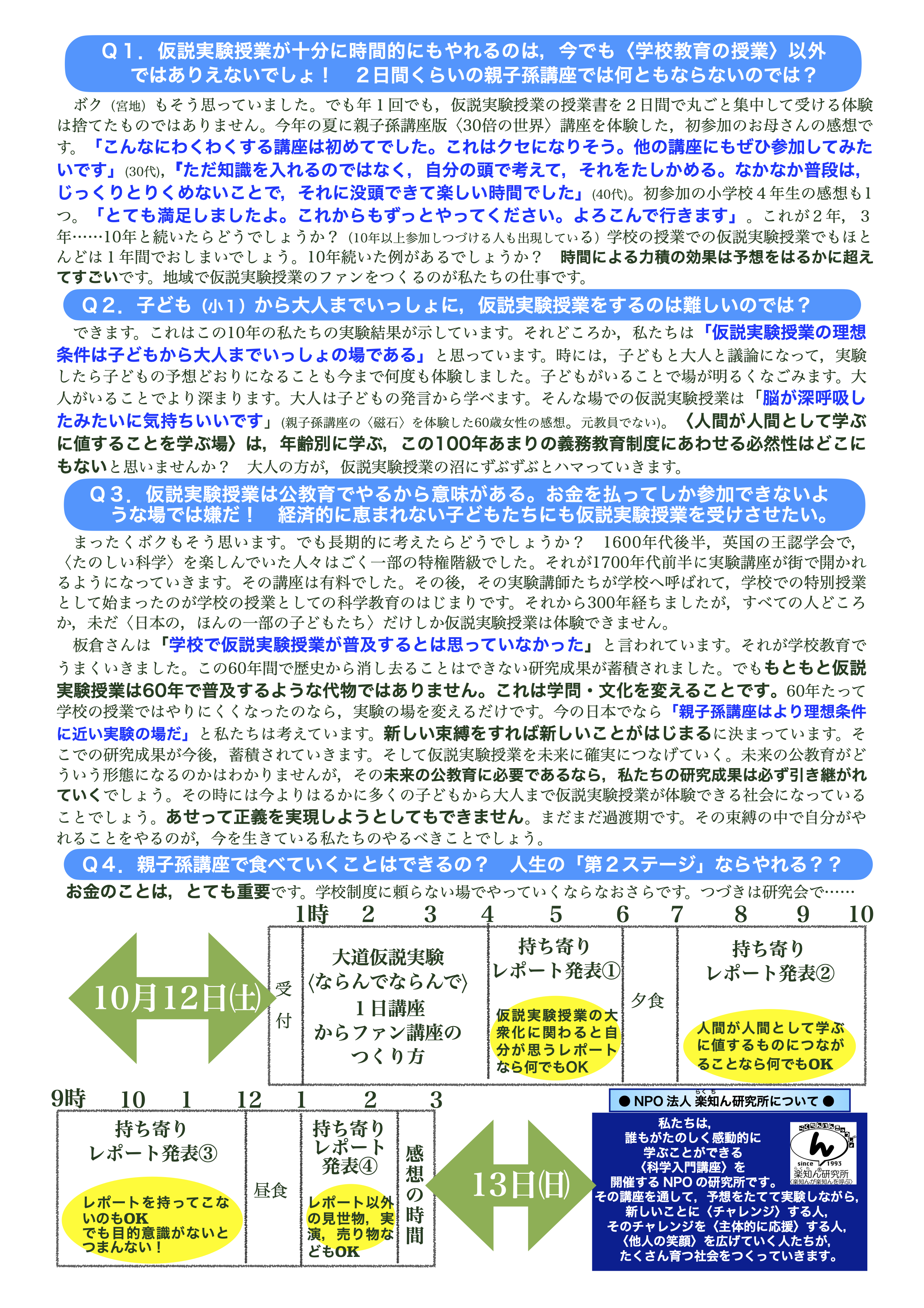 仮説実験授業〈大衆化への道〉講座&研究会 2024 仮説実験授業〈大衆化への道〉講座&研究会 2024は,WEB申し込みができます。 参加しよう!と決めて,会場名を選択してください 必須 –会場名を選択–大衆化への道 講座&研究会(2024/10/12,13) 電話番号 必須(必須,講座当日にもご連絡できますために携帯推奨) メールアドレス 必須( Gmailアドレス以外のアドレスをご利用ください。Gmailに送信できないことが多発しておりますため。また携帯では,@luctin.org を受け取れる設定をお願いします。自動返信メールが届かないときは,ドメインの指定受信設定をしてください。) 申込代表者様(タブ>で「名」に移動できます) 姓 必須 名 必須 参加者情報:1行に1名ずつご記入ください。 全員の氏名・年齢 郵便番号 市区郡 町名・番地 講座参加にひとこと!:ぜひおきかせください♪ 主催者は,みなさんからのひと言をとてもたのしみにしています! 講座のことを何で知りましたか?: 楽知ん研究所のメルマガ知り合いからすすめられて楽知ん研究所のWebFacebookやブログ図書館のチラシ学校で配られたチラシ広報や雑誌の記事そのほか 必須 この内容で申し込みしますか? (チェックボックスにチェックをいれてください) ころりんじーさんを 押すと「送信」できます。 ※送信後10分以内に 自動返信メールが届かないときは, ご記入いただいたアドレスや メールフィルタの設定を ご確認ください。